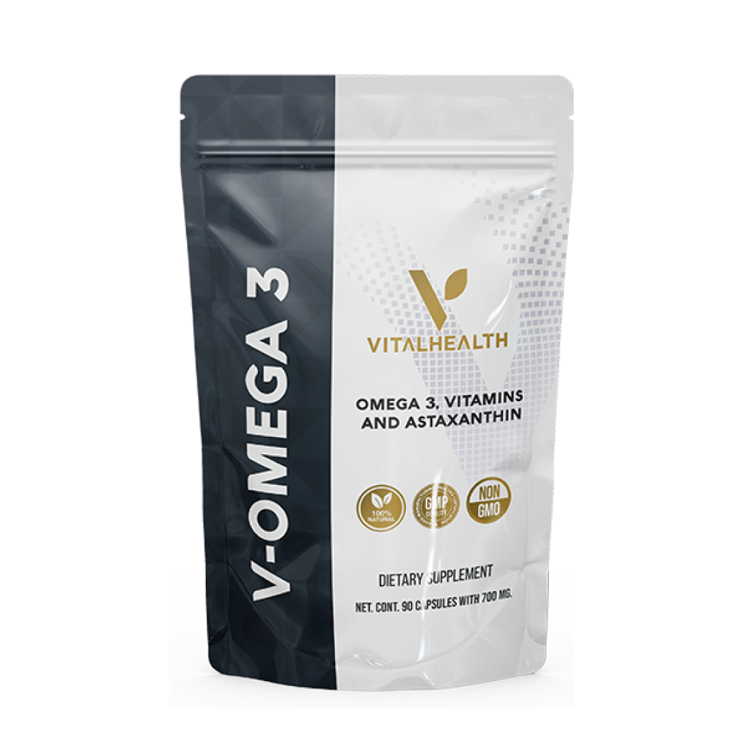 V-OMEGA 3 es un suplemento en cápsulas blandas formulado con Omega 3 de alta calidad, EPA, DHA, tocotrienoles y astaxantina, diseñado para favorecer la salud cardiovascular, mejorar la función cognitiva y proteger las células contra el estrés oxidativo.